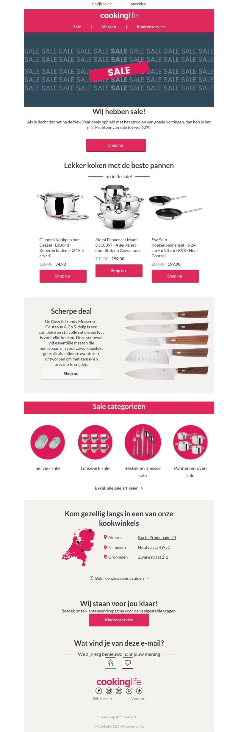 Cookinglife lanceert een grootse sale met kortingen tot 60% op topmerken. Geniet van fantastische deals op kookpannen, messen en meer. Ook servies en glaswerk zijn in de aanbieding. Deze sale biedt een geweldige kans om je keukencollectie uit te breiden voor een fractie van de prijs. Bezoek onze winkels voor nog meer speciale aanbiedingen en persoonlijke service.