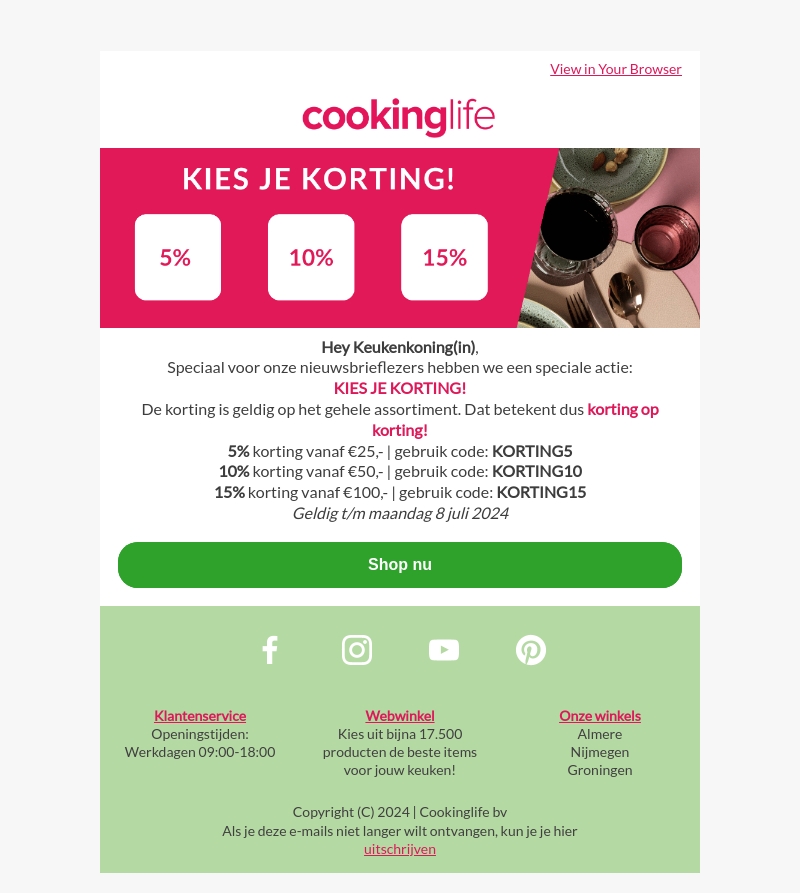Hey Keukenkoning(in), speciaal voor onze nieuwsbrieflezers hebben we een speciale actie: KIES JE KORTING! Ontvang 5%, 10%, of 15% korting op het gehele assortiment. Geldig t/m maandag 8 juli 2024.