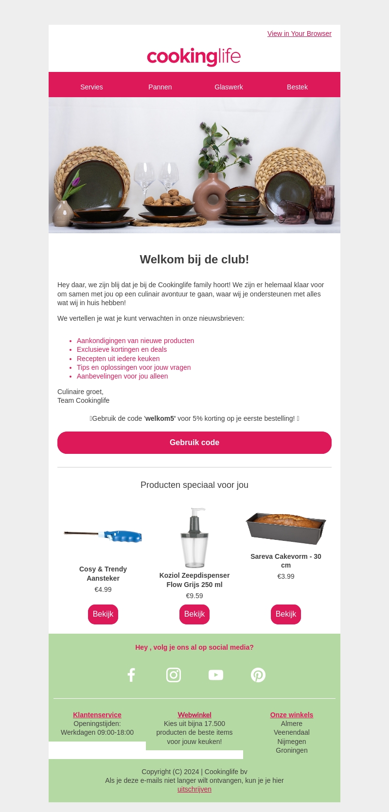 Hey daar, welkom bij de Cookinglife family! Profiteer van exclusieve kortingen en deals, ontdek nieuwe producten, en krijg recepten uit iedere keuken. Gebruik de code welkom5 en ontvang 5% korting op je eerste bestelling.