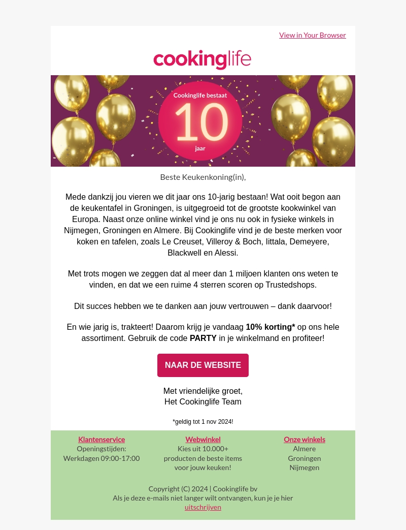 Cookinglife viert zijn 10-jarig bestaan met een speciale korting. Van een kleine start in Groningen is het uitgegroeid tot de grootste kookwinkel van Europa met fysieke winkels in Almere, Groningen en Nijmegen. Om dit te vieren, biedt Cookinglife 10% korting op alle producten. Gebruik de kortingscode PARTY en profiteer tot 1 november 2024.