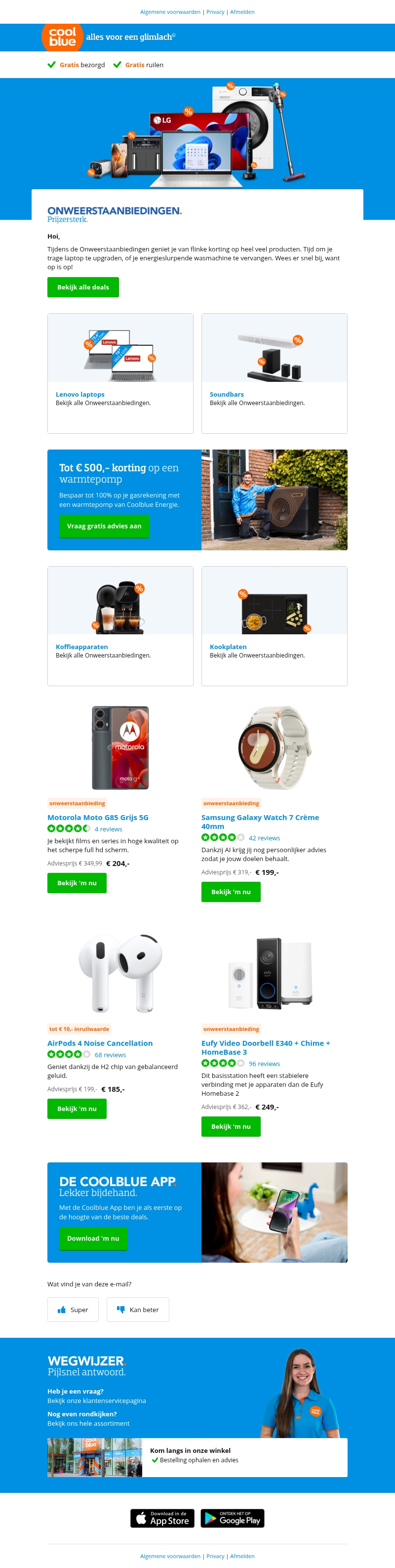 Bezoek Coolblue voor ongelooflijke deals op technologie en huishoudelijke apparaten. Ontvang tot €500 korting op een warmtepomp en bespaar op uw energierekening. Vind aanbiedingen op Lenovo laptops, LG soundbars, koffiemachines, en meer. Mis niet de nieuwste mobiele telefoons en smartwatches met scherpe prijzen. Download de Coolblue-app voor de beste deals.