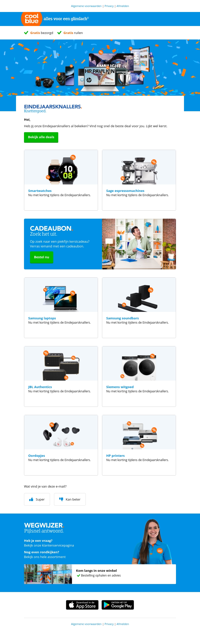 Mis de laatste Eindejaarsknallers van Coolblue niet. Met spectaculaire kortingen op producten zoals smartwatches, espressomachines, en nog veel meer is er voor ieder wat wils. Zoek het perfecte cadeau met onze cadeaubonnen of upgrade je tech met korting. Dit is jouw kans om te genieten van geweldige deals vlak voor het nieuwe jaar.