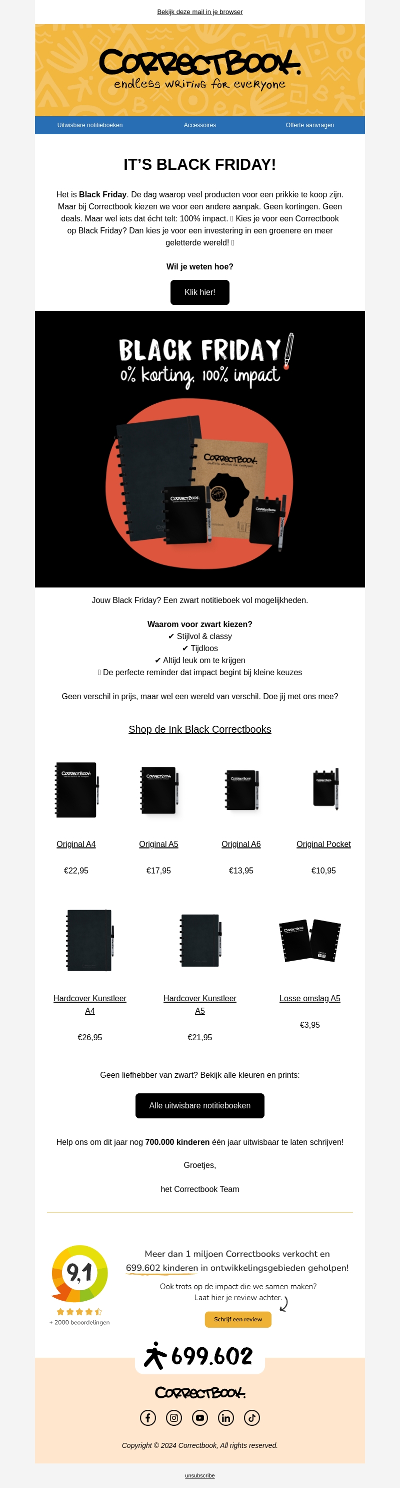 Het is Black Friday bij Correctbook, maar zonder standaard kortingen! Krijg 6% korting op elke aankoop en investeer in een groene en meer geletterde wereld. Kies voor stijlvolle en tijdloze notitieboeken met impact. Geen prijsverschil, maar wel een wereld van verschil. Doe mee en steun ons doel om 700.000 kinderen te helpen.