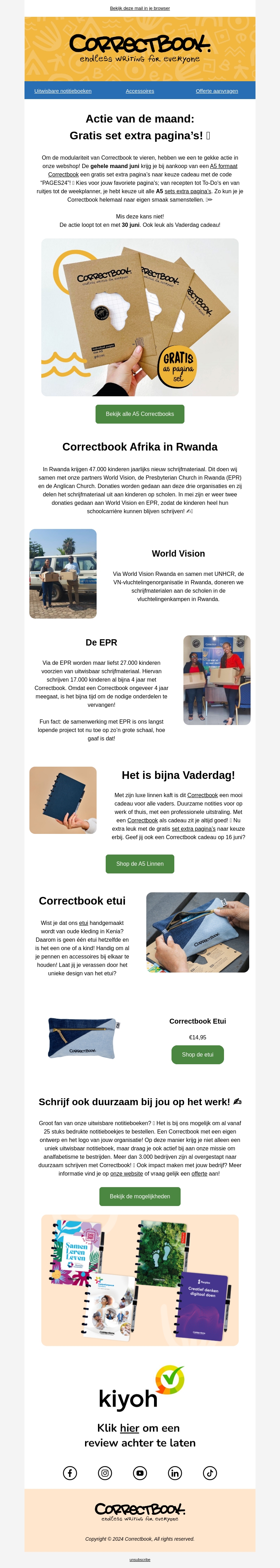 Deze maand biedt Correctbook een gratis set extra pagina's aan bij elke aankoop! Ontdek hoe wij samen met World Vision en EPR kinderen in Rwanda ondersteunen met nieuwe schrijfmaterialen. Vergeet ook niet een Correctbook cadeau te geven voor Vaderdag!