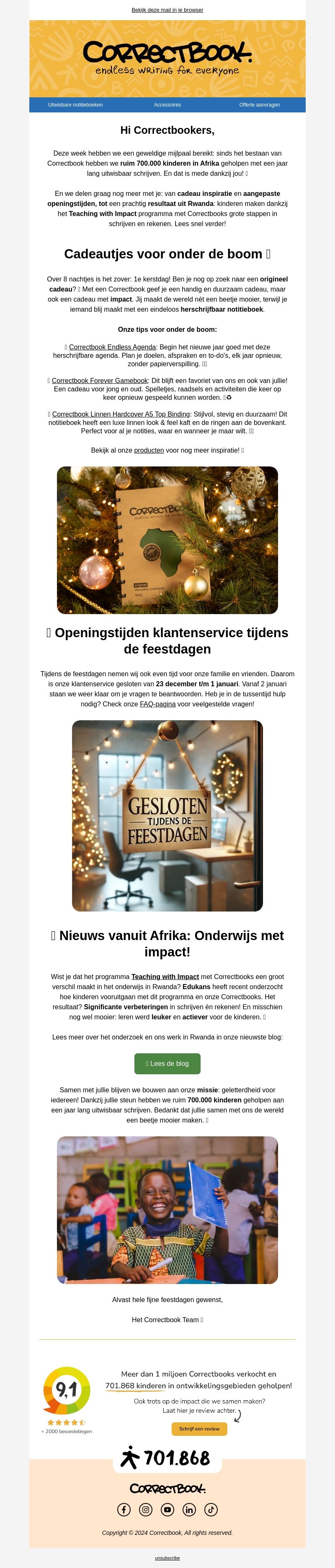 Correctbook viert een geweldige mijlpaal: ruim 700.000 kinderen in Afrika zijn geholpen dankzij hun programma's. Dit seizoen bieden zij speciale cadeautips voor de feestdagen. Ontdek hoe hun 'Teaching with Impact'-programma de educatie in Rwanda versterkt. Geniet ook van hun duurzame en stijlvolle notitieboeken als perfect cadeau. Meer nieuws en het verhaal achter hun impact vind je in deze nieuwsbrief.