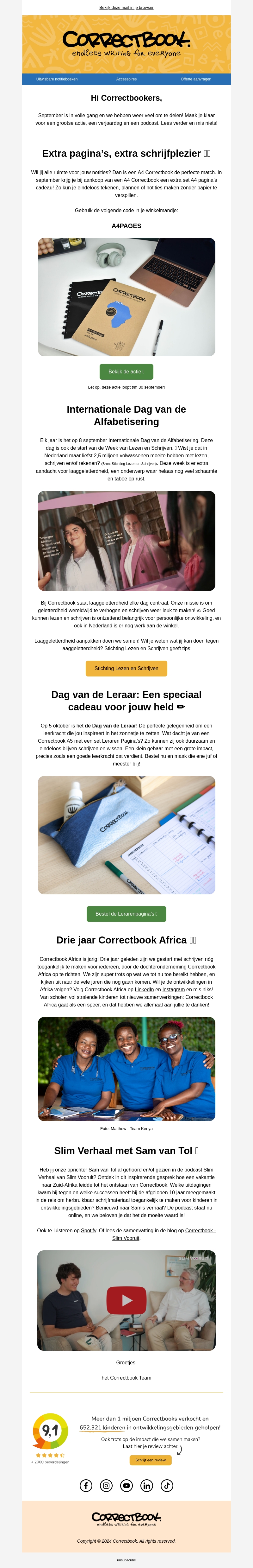 September staat in het teken van extra pagina’s en speciale acties bij Correctbook! Ontvang gratis extra pagina’s bij je A4 Correctbook en vier de Dag van de Alfabetisering en de Dag van de Leraar met ons. Kom meer te weten over onze impact in Afrika en ontdek de inspirerende verhalen van ons Correctbook team.