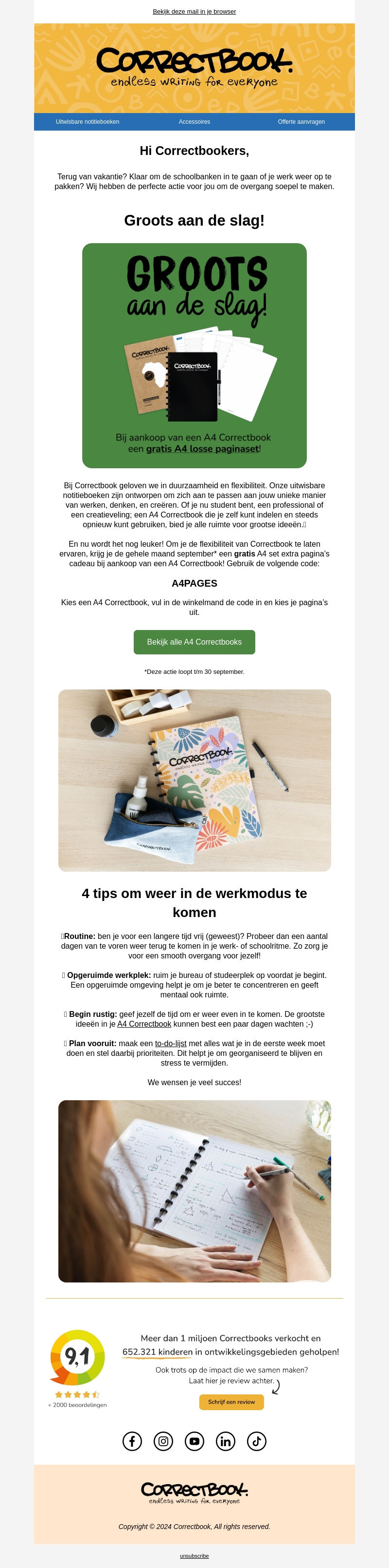 Ben je terug van vakantie en klaar om weer aan de slag te gaan? Bij Correctbook vind je de perfecte notitieboeken om je werk of studie soepel te hervatten. Geniet bovendien van een gratis set A4 losse pagina's bij elke aankoop van een A4 Correctbook in september. Ontdek ook handige tips om weer in de werkmodus te komen.