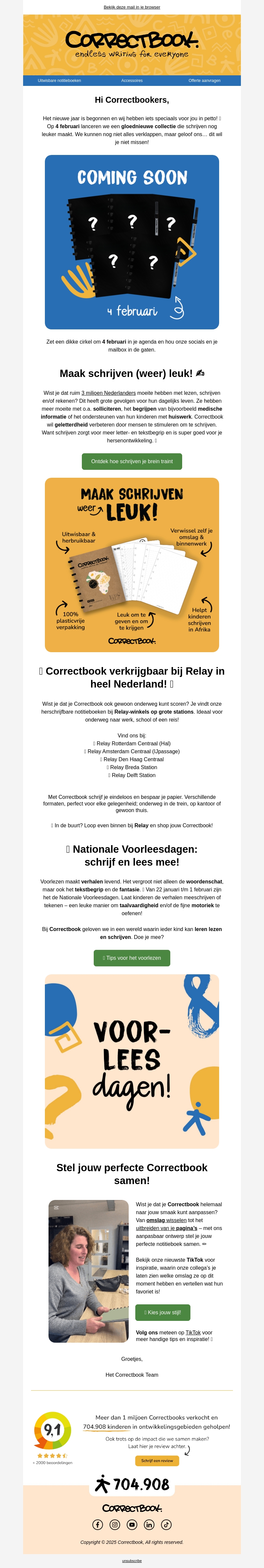 Correctbook presenteert hun nieuwste collectie! Vanaf 4 februari kun je de nieuwste schrijfboeken ontdekken. Deze collectie biedt eindeloos schrijfplezier met uitwisbare pagina's en unieke ontwerpen. Wacht niet langer, ontdek het plezier van schrijven opnieuw. Correctbook is overal in Nederland verkrijgbaar bij Relay. Doe mee aan de Nationale Voorleesdagen!