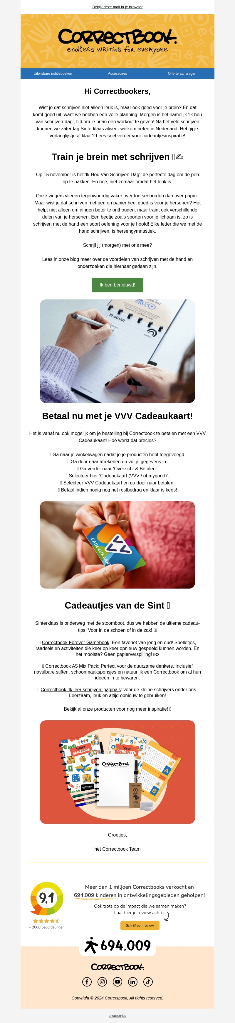 In deze nieuwsbrief ontdek je hoe schrijven je brein kan trainen. Ontdek leuke Sinterklaascadeautjes waarmee je zowel jong als oud kunt verrassen. Daarnaast introduceert Correctbook de mogelijkheid om te betalen met de VVV Cadeaukaart. Maak de feestdagen speciaal met duurzame en educatieve geschenken. Lees verder voor meer inspiratie.