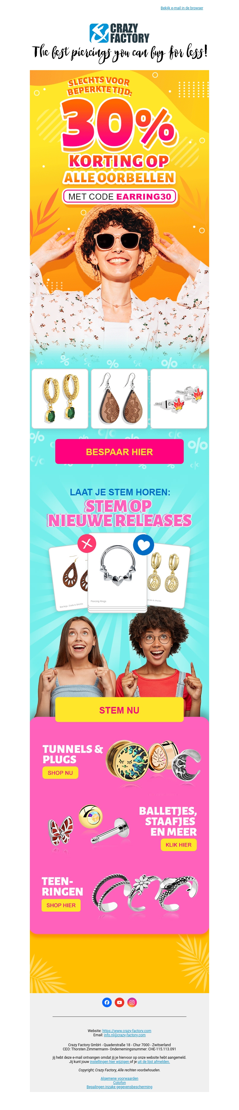 Mis deze exclusieve aanbieding van Crazy Factory niet! Ontvang nu 30% korting op alle oorbellen met de code EARRING30. Deze deal is slechts voor een beperkte tijd beschikbaar, dus wacht niet te lang. Beklijke nieuwe stijlen en stem op je favorieten!