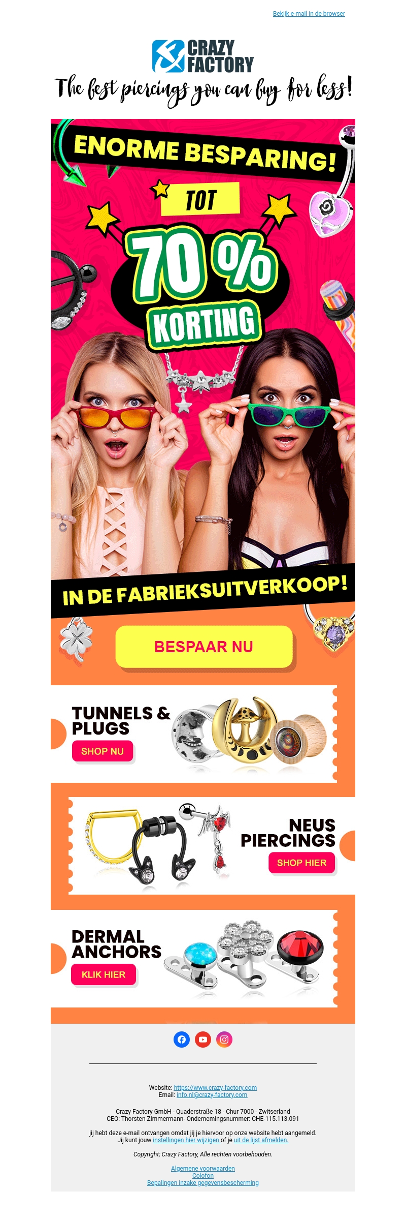 Maak je klaar voor enorme besparingen met korting tot wel 70% bij de Crazy Factory fabrieksuitverkoop! Ontdek onze uitgebreide collectie tunnels & plugs, neuspiercings en dermal anchors tegen ongelooflijke prijzen. Bespaar nu en verwen jezelf met onze hoogwaardige sieraden. Bezoek onze website voor meer informatie en koop nu!
