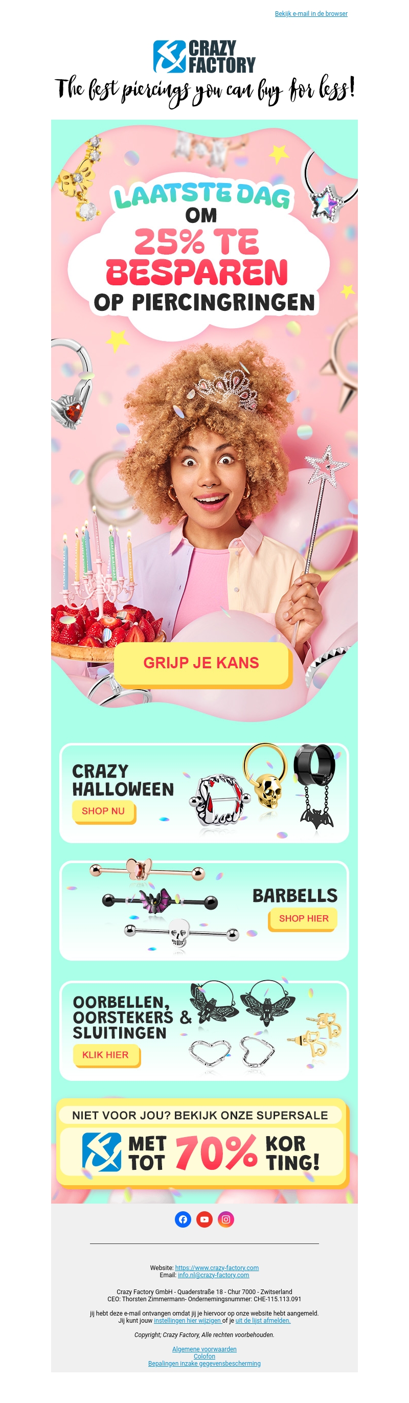 Het is de laatste dag om te profiteren van 25% korting op piercingringen bij Crazy Factory. Grijp deze kans om te besparen op stijlvolle barbells en meer. Daarnaast zijn er ook Crazy Halloween deals beschikbaar. Bezoek onze supersale voor kortingen tot 70%! Ontdek nu de beste aanbiedingen voordat het te laat is.
