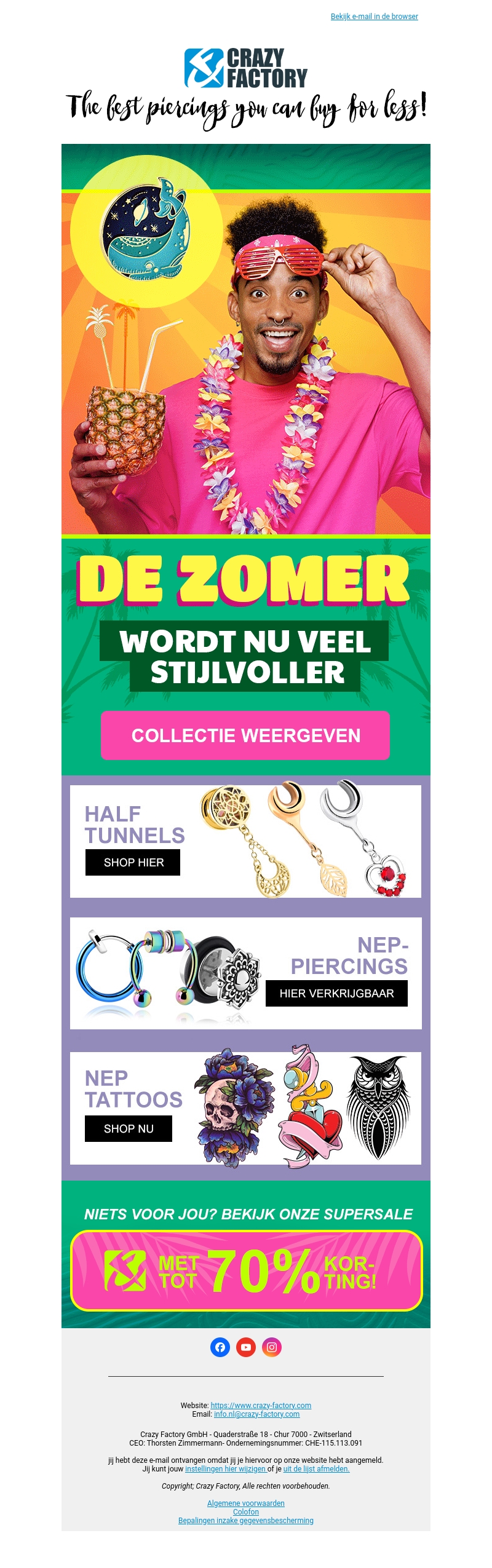 De zomer is hier en dat betekent tijd voor nieuwe piercings! Crazy Factory biedt de meest trendy en stijlvolle piercings van dit seizoen. Van half tunnels tot neptattoos, er is voor ieder wat wils. Mis onze exclusieve kortingen tot 70% niet. Bekijk nu onze collectie en maak je zomer look compleet!