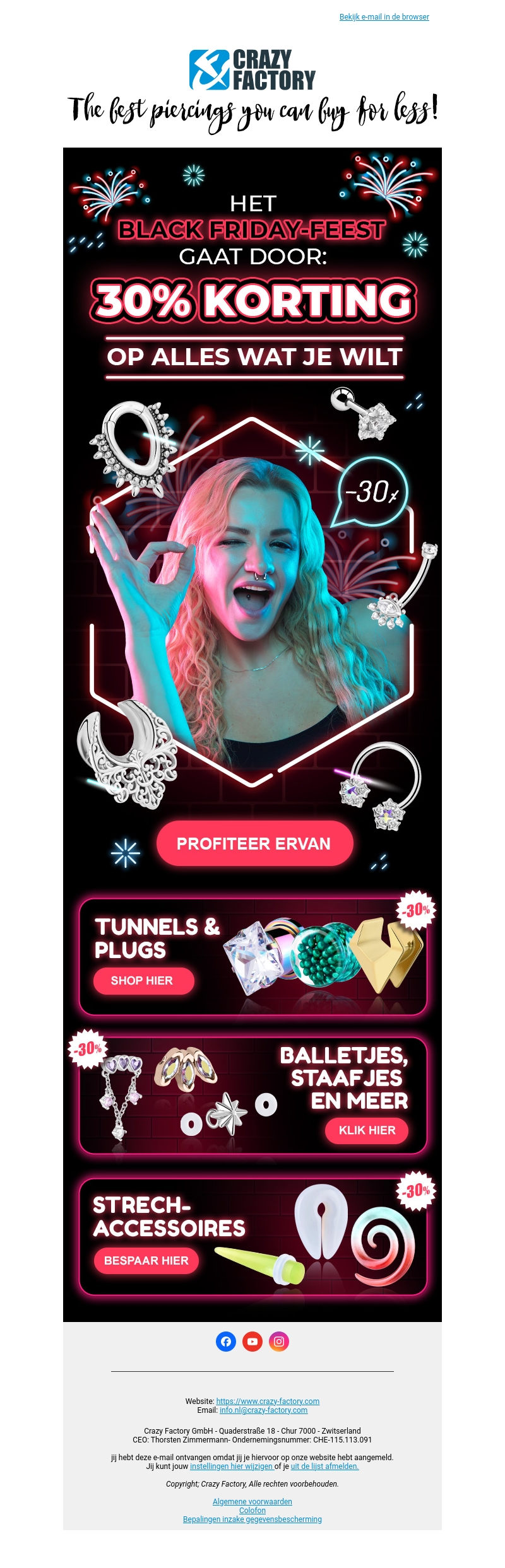 Het Black Friday-weekend bij Crazy Factory gaat door met een spectaculaire korting van 30% op alle producten. Van tunnels en plugs tot balletjes en stretch-accessoires, alles is nu extra voordelig. Grijp je kans om prachtige piercings met hoge kwaliteit tegen bodemprijzen te scoren. Mis deze kans voor de ultieme besparing niet. Bezoek onze website en ontdek de deals.