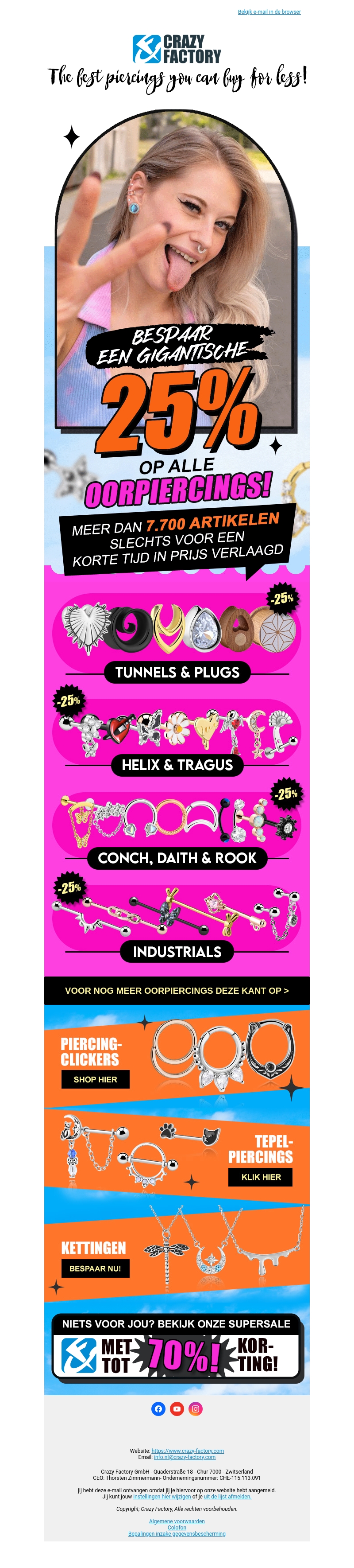 Profiteer nu van een gigantische 25% korting op alle oorpiercings bij Crazy Factory! Met meer dan 7.700 artikelen, waaronder tunnels, plugs, helix, tragus, conch, daith, rook, en industrial piercings, is er iets voor iedereen. Daarnaast hebben we ook piercing-clickers en tepelpiercings. Bekijk onze geweldige aanbiedingen en bespaar groots!