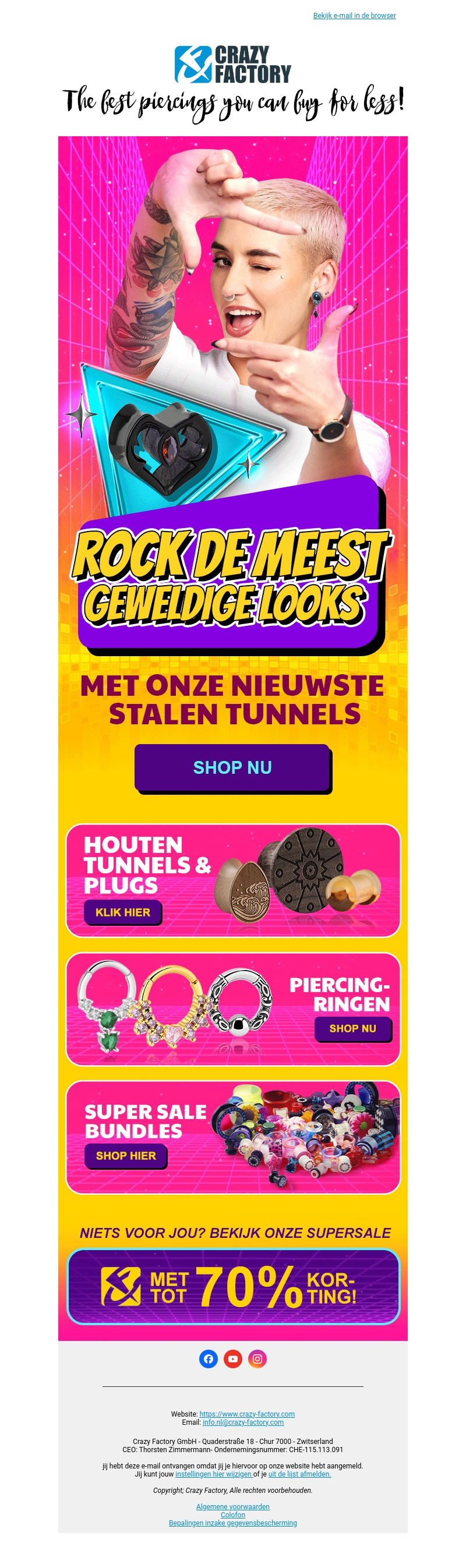 Maak kennis met onze nieuwste collectie stalen tunnels. Deze geweldige items brengen je piercing stijl naar een hoger niveau. Daarnaast hebben we houten tunnels en plugs, schitterende piercing ringen en exclusieve bundles in de aanbieding.