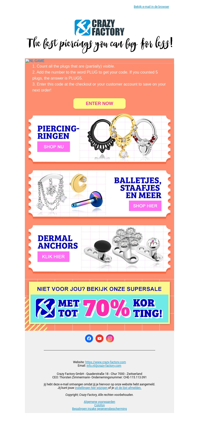 Doe mee met onze spannende puzzel en maak kans op 250 Crazy Cash Punten! Tel alle zichtbare plugs, voeg het nummer toe aan het woord PLUG en gebruik dit als je kortingscode. Verder ontdek je hier de mooiste piercingringen, balletjes en staafjes, en dermal anchors. Voor jou tot 70% korting op geselecteerde items!