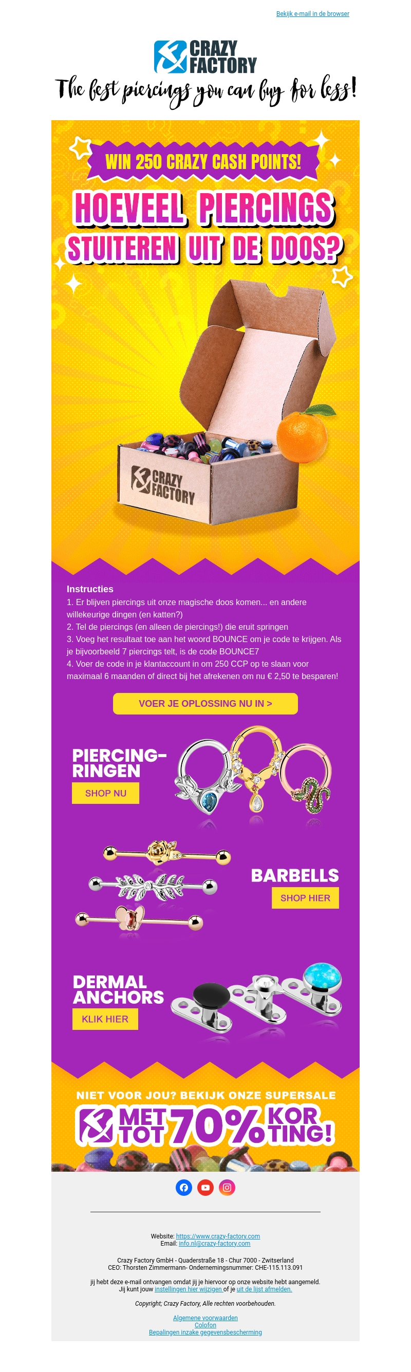 Tel de piercings in de magische doos en win 250 Crazy Cash Points! Doe nu mee en gebruik de code BOUNCE7 om te profiteren van deze geweldige kans. Vergeet ook niet om onze speciale kortingsacties te bekijken voor geweldige deals op piercings en meer.