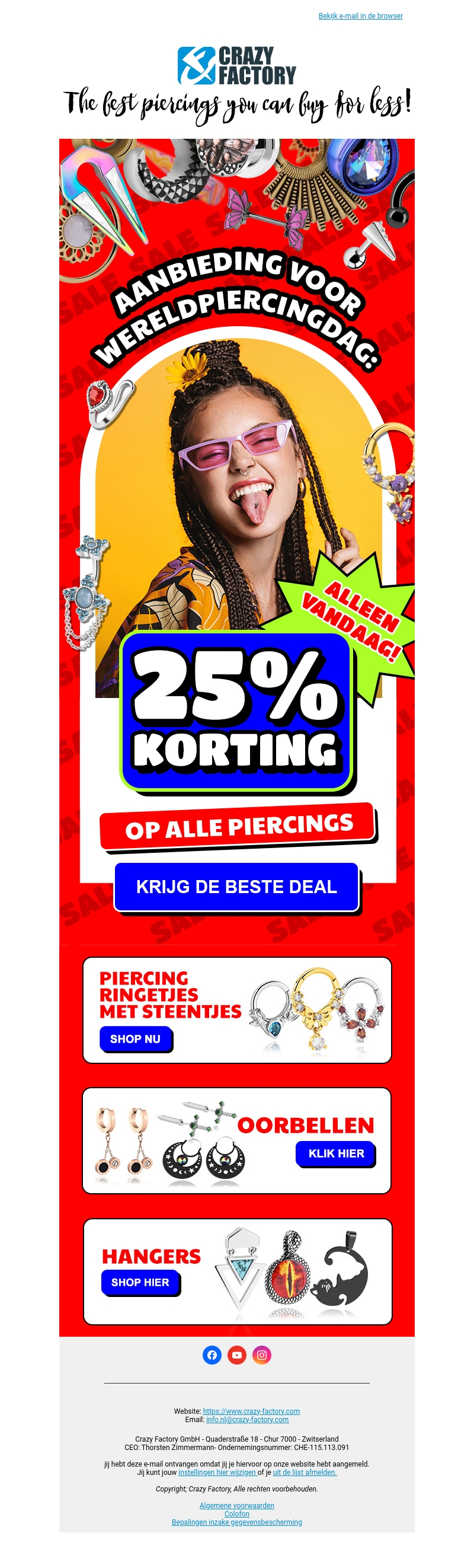 Ter gelegenheid van Wereldpiercingdag biedt Crazy Factory je een fantastische 25% korting op alle piercings. Of je nu op zoek bent naar stijlvolle oorbellen, opvallende ringen met steentjes of unieke hangers, deze aanbieding is alleen vandaag geldig. Grijp je kans en vernieuw je stijl met de beste deals!