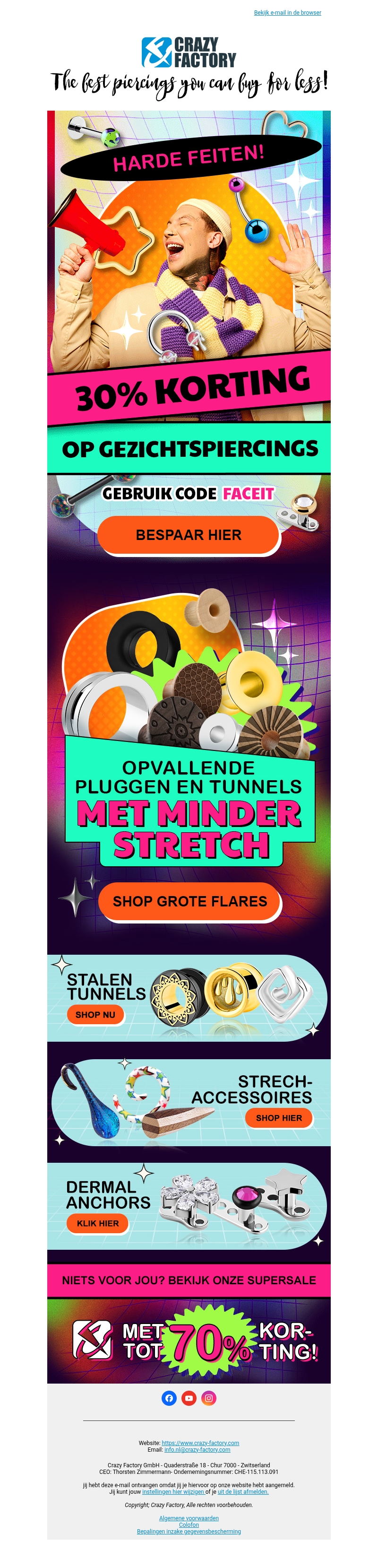 Crazy Factory biedt nu een fantastische korting van 30% op gezichtspiercings. Ontdek een breed assortiment aan opvallende plugs en tunnels zonder veel stretch. Gebruik de kortingscode FACEIT om direct te besparen. Mis deze geweldige kans niet om je look te vernieuwen voor minder. Daarnaast zijn er ook grote kortingen op andere producten, zoals dermal anchors en stretch-accessoires.