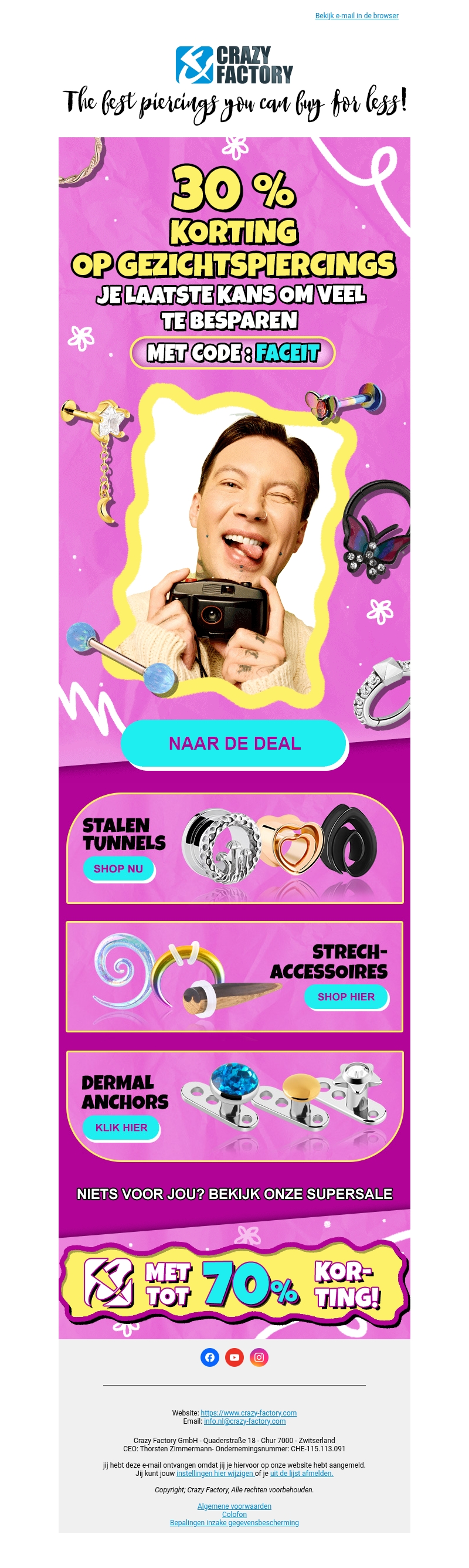 De aftelling is begonnen! Vandaag is de laatste kans om te profiteren van 30% korting op gezichtspiercings bij Crazy Factory. Ontdek een breed scala aan stijlen en accessoires die je look compleet maken. Mis deze geweldige deal niet en krijg de piercing die je altijd al wilde. Gebruik de code FACEIT voor extra korting. Bezoek nu onze website en shop de beste piercings voor minder!