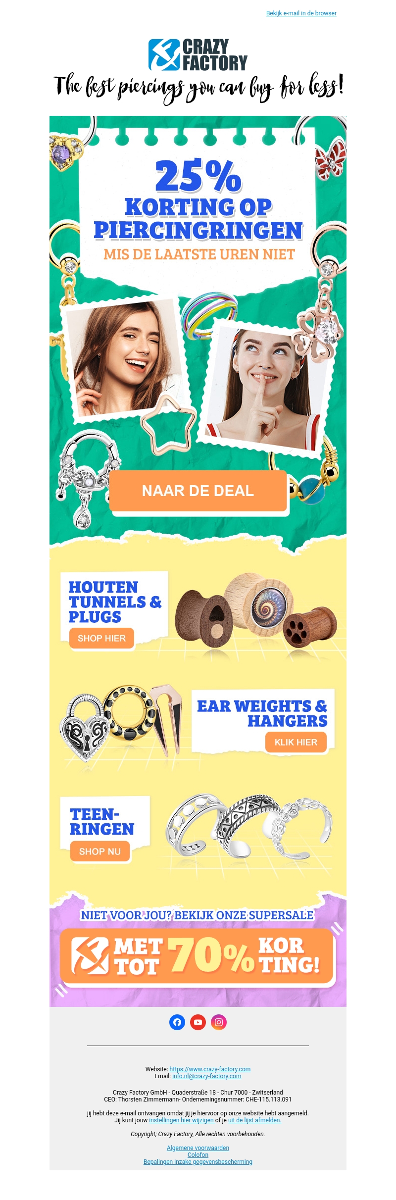 Ontdek de beste deals op piercingringen met een fantastische 25% korting, alleen voor vandaag. Crazy Factory biedt een breed assortiment aan sieraden voor jouw unieke stijl. Mis deze kans niet om te besparen op topkwaliteit piercings. Naast piercingringen zijn er ook grote kortingen op andere sieraden. Bekijk de specialiteiten zoals houten tunnels, plugs, en ear weights. Haal het meeste uit deze tijdsgebonden aanbieding!