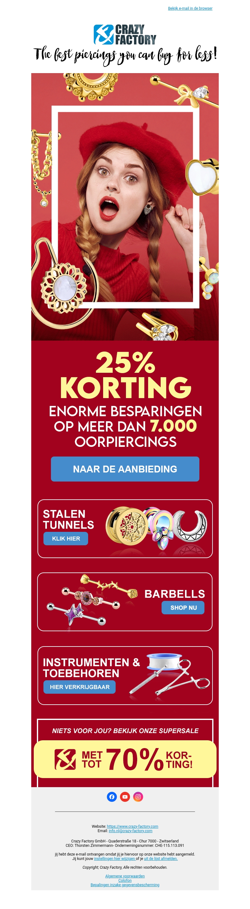 Mis deze kans niet om je oren te versieren met onze stijlvolle piercings. Ontvang 25% korting op een breed assortiment van meer dan 7.000 oorpiercings. Of je nu op zoek bent naar stalen tunnels, barbells of accessoires, bij ons ben je aan het juiste adres. Bezoek onze webshop en ontdek de fantastische aanbiedingen. Er is voor ieder wat wils om je persoonlijke stijl aan te vullen.