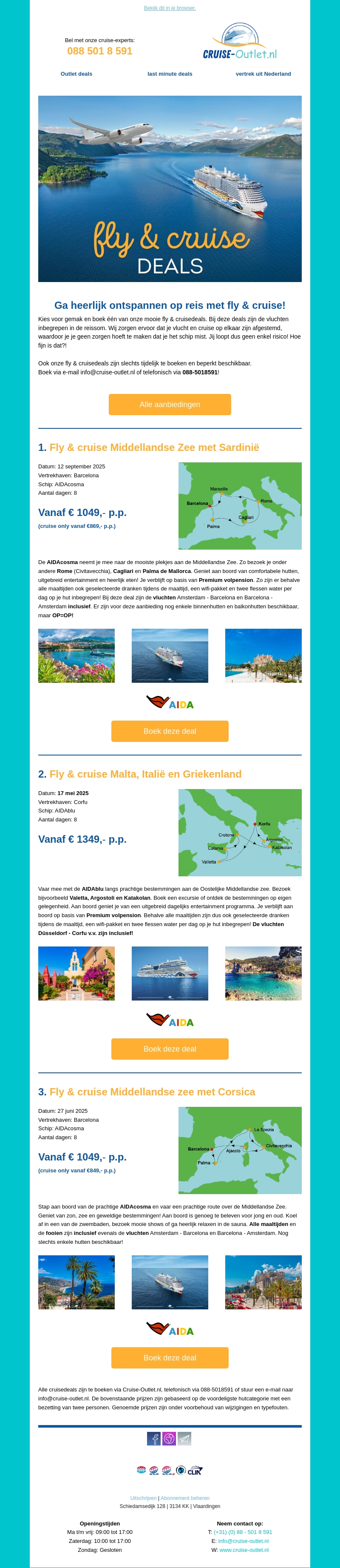 Kies voor een zorgeloze vakantie met onze fly & cruise deals naar prachtige bestemmingen. Ontdek de Middellandse Zee aan boord van luxueuze schepen en geniet van een onvergetelijke reiservaring. Boek nu je exclusieve reis met vertrek vanuit Nederland.