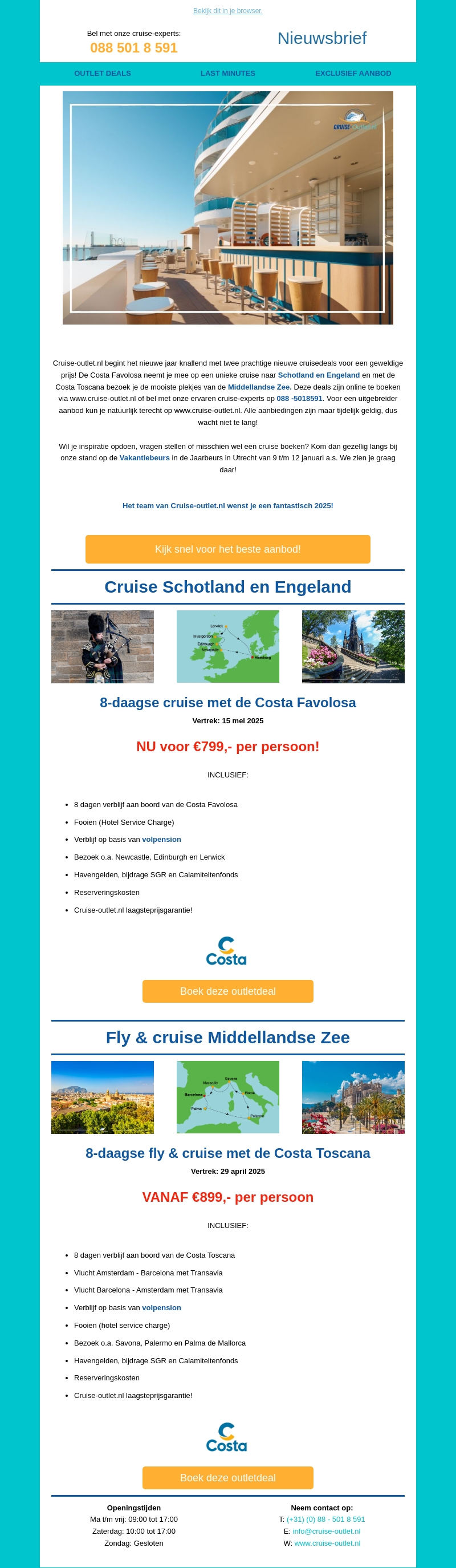 Cruise-Outlet.nl presenteert spectaculaire nieuwe cruisedeals voor 2025. Ontdek betoverende bestemmingen zoals Schotland, Engeland en de Middellandse Zee met aantrekkelijke tarieven. Profiteer van 8-daagse cruises inclusief volpension en excursies. Beperkte aanbieding, wacht niet langer en boek nu!