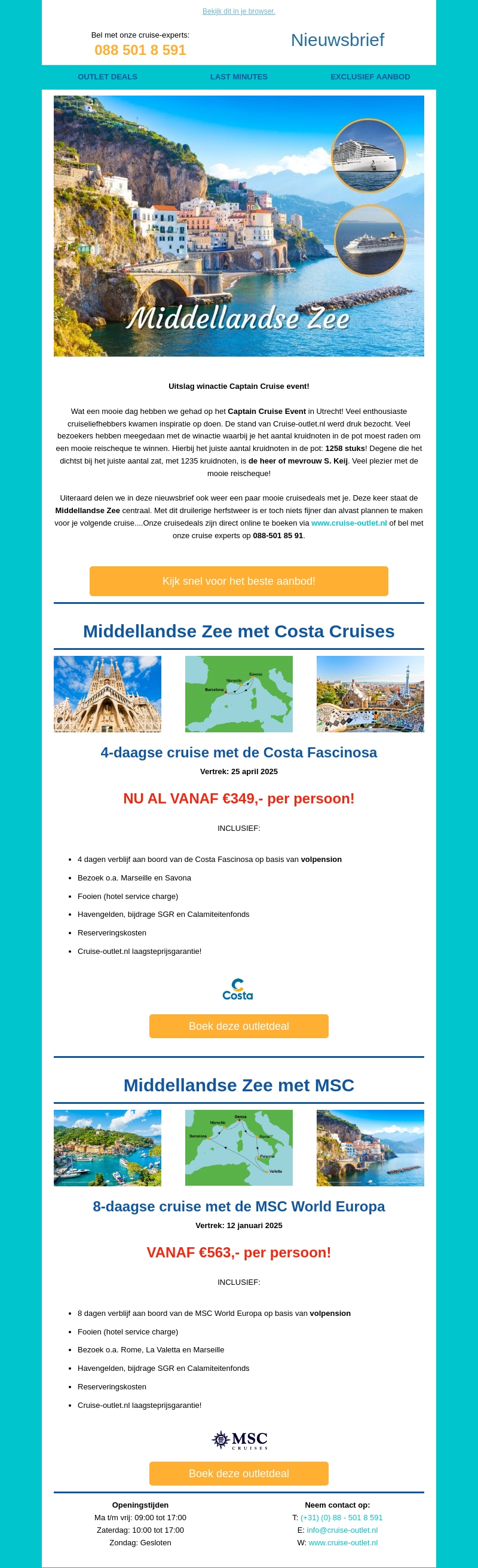 In deze nieuwsbrief delen we de uitslag van het Captain Cruise Event en presenteren we spannende cruisedeals langs de Middellandse Zee. Profiteer van exclusieve aanbiedingen met Costa Cruises en MSC voor korte en lange trips. Boek nu uw droomreis en geniet van de laagste prijsgarantie!