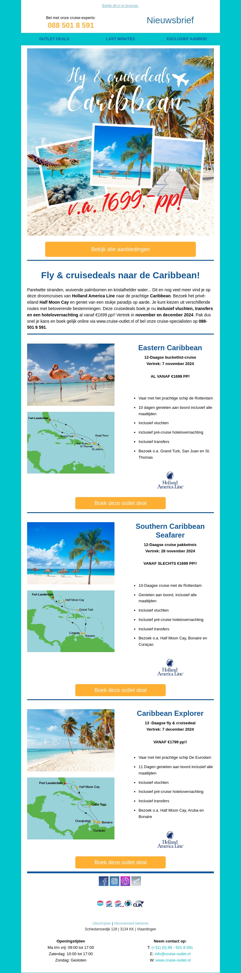 Ontdek de prachtige Caribbean met onze exclusieve fly & cruisedeals! Geniet van parelwitte stranden en kristalhelder water met Holland America Line. Inclusief vluchten, transfers en hotelovernachtingen vanaf slechts €1699 p.p. Boek nu!