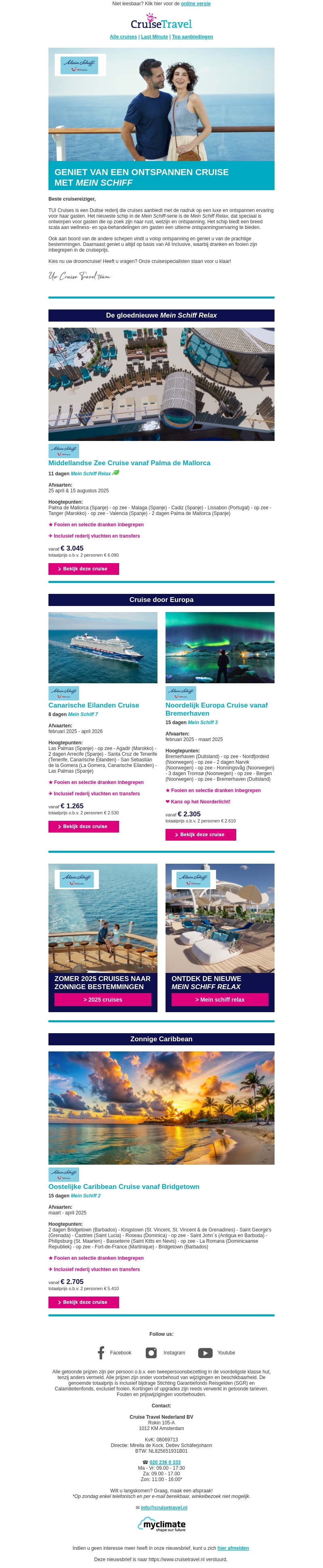 Ontdek de ultieme luxe en ontspanning met Mein Schiff cruises. Kies uit diverse prachtige bestemmingen zoals de Middellandse Zee en de Caraïben. Geniet van uitstekende faciliteiten aan boord met all-inclusive optiepakketten. Maak herinneringen die een leven lang meegaan met adembenemende uitzichten en unieke ervaringen. Boek vandaag nog uw droomcruise. Beperkte beschikbaarheid!
