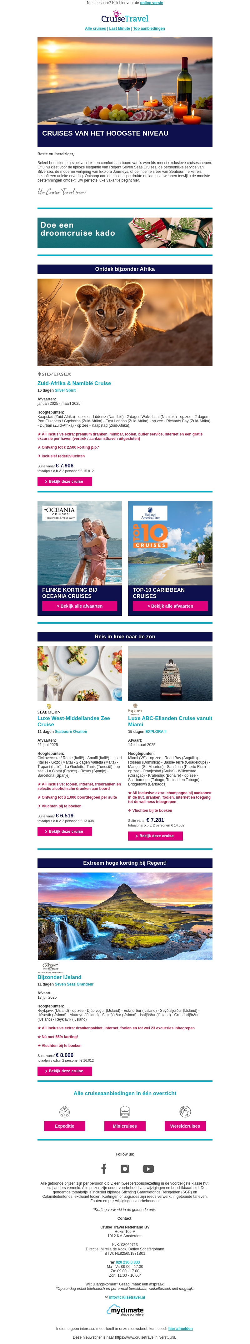Beleef luxe als nooit tevoren met onze exclusieve cruise-aanbiedingen. Ontdek adembenemende bestemmingen zoals Zuid-Afrika, de ABC-Eilanden en IJsland. Geniet van uitzonderlijke service, elegante suites en onvergetelijke ervaringen. Verwen uzelf of geef een droomcruise cadeau aan een geliefde. Boek nu om te profiteren van onze aantrekkelijke kortingen.