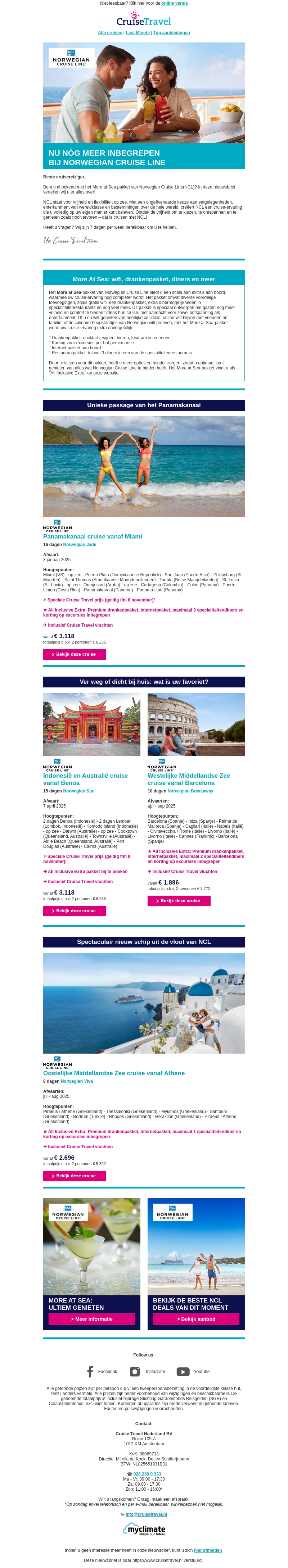 Beleef ultiem comfort met Norwegian Cruise Line's nieuwe inclusieve pakketten. Wifi, drankjes en diner zijn nu inbegrepen, wat zorgt voor een zorgeloze ervaring op zee. Ontdek de unieke reisroutes, zoals een cruise door het Panamakanaal of de Middellandse Zee, met spectaculaire nieuwe schepen. Boek nu en profiteer van speciale tarieven en aanbiedingen. Uw avontuur begint zodra u aan boord stapt.