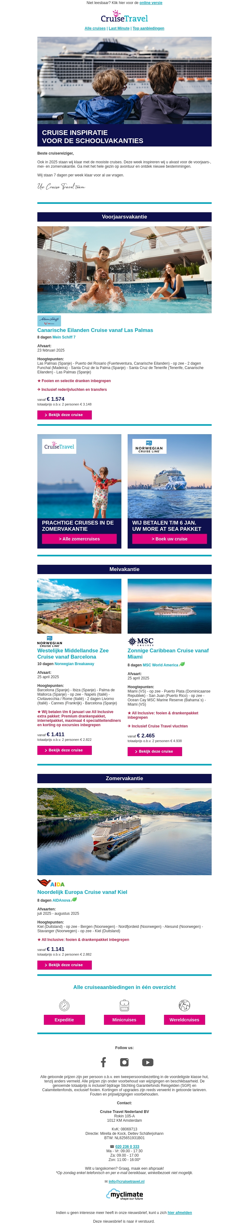 De schoolvakanties zijn het perfecte moment voor een adembenemende cruise-ervaring. Verken bestemmingen zoals de Canarische Eilanden, de Middellandse Zee, en de Caribbean met onze voordelige aanbiedingen. Geniet van familievriendelijke voorzieningen en kom volledig tot rust. Boek nu een cruise die bij je past en maak van je vakantie een onvergetelijk avontuur.