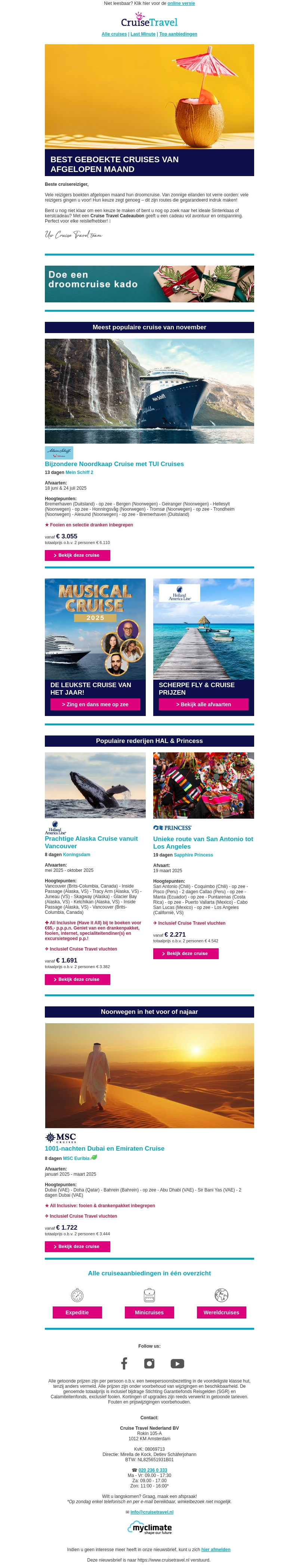 Ontdek welke cruises de afgelopen maand het meest populair waren. Van de Noordkaap tot aan de Emiraten, deze reizen bieden de ultieme vakantie-ervaring. Lees meer over elke reis en boek uw droomcruise nu. Mis de speciale kortingen en aanbiedingen niet die hieronder vermeld staan. Krijg inspiratie voor uw volgende avontuur en geniet van exclusieve voordelen. Bekijk de volledige details en start uw reis bij Cruise Travel.