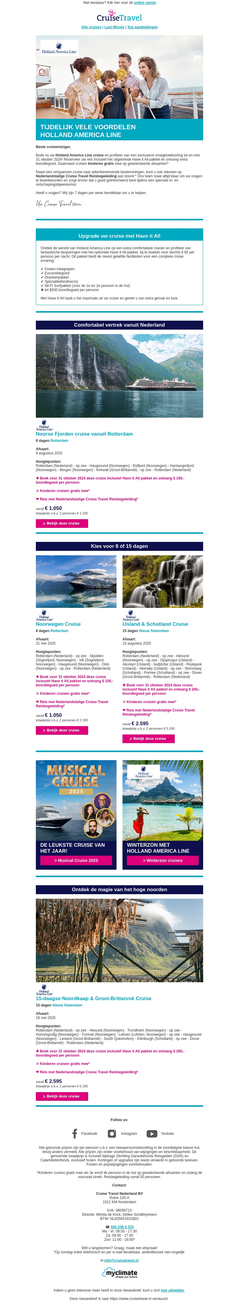 Ontdek de exclusieve voordelen van Holland America Line met vroegboekkortingen. Kinderen reizen gratis en u geniet van volledige reisbegeleiding. Geniet van prachtige Noorse Fjorden cruises en avontuurlijke reizen naar IJsland en Schotland. Reserveer nu uw plek en ontvang speciale pakketten voor extra gemak en luxe. Reis gerust en zorgeloos met Cruise Travel.