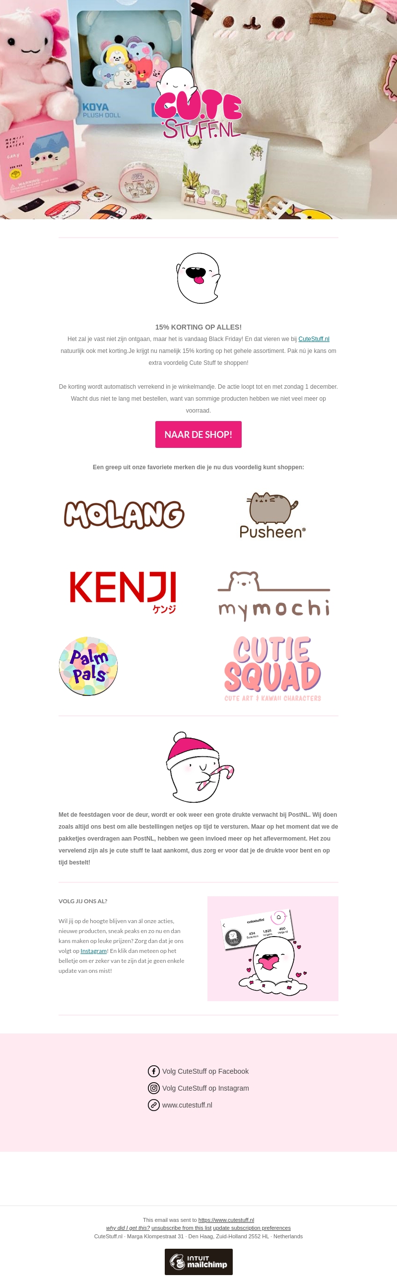 Vier Black Friday met CuteStuff en geniet van 15% korting op het volledige assortiment. Mis deze kans niet om jouw favoriete kawaii items voordelig te scoren. De korting wordt automatisch verrekend in je winkelmandje en de actie loopt tot en met 1 december. Wees er snel bij, want de voorraad is beperkt. Volg ons ook op social media voor de laatste updates.