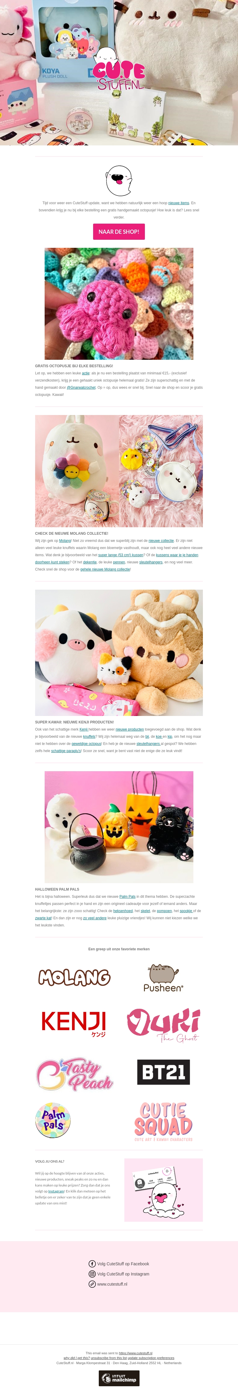 Maak kennis met onze schattige knuffeltjes en ontdek de nieuwste collecties. Geniet van een gratis octopusje bij elke bestelling. Verken ook onze nieuwe Kawaii en Kerst items. Mis deze exclusieve aanbiedingen niet en breng meer knuffelzachtheid in je leven!