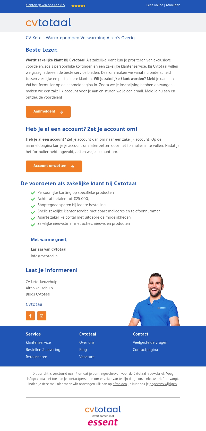 Word zakelijke klant bij Cvtoaal en profiteer van exclusieve voordelen zoals persoonlijke kortingen en een uitgebreide klantenservice. Meld je nu aan en ontdek de voordelen van een zakelijk account. Bestaande klanten kunnen eenvoudig hun account omzetten naar een zakelijk account voor extra voordelen.
