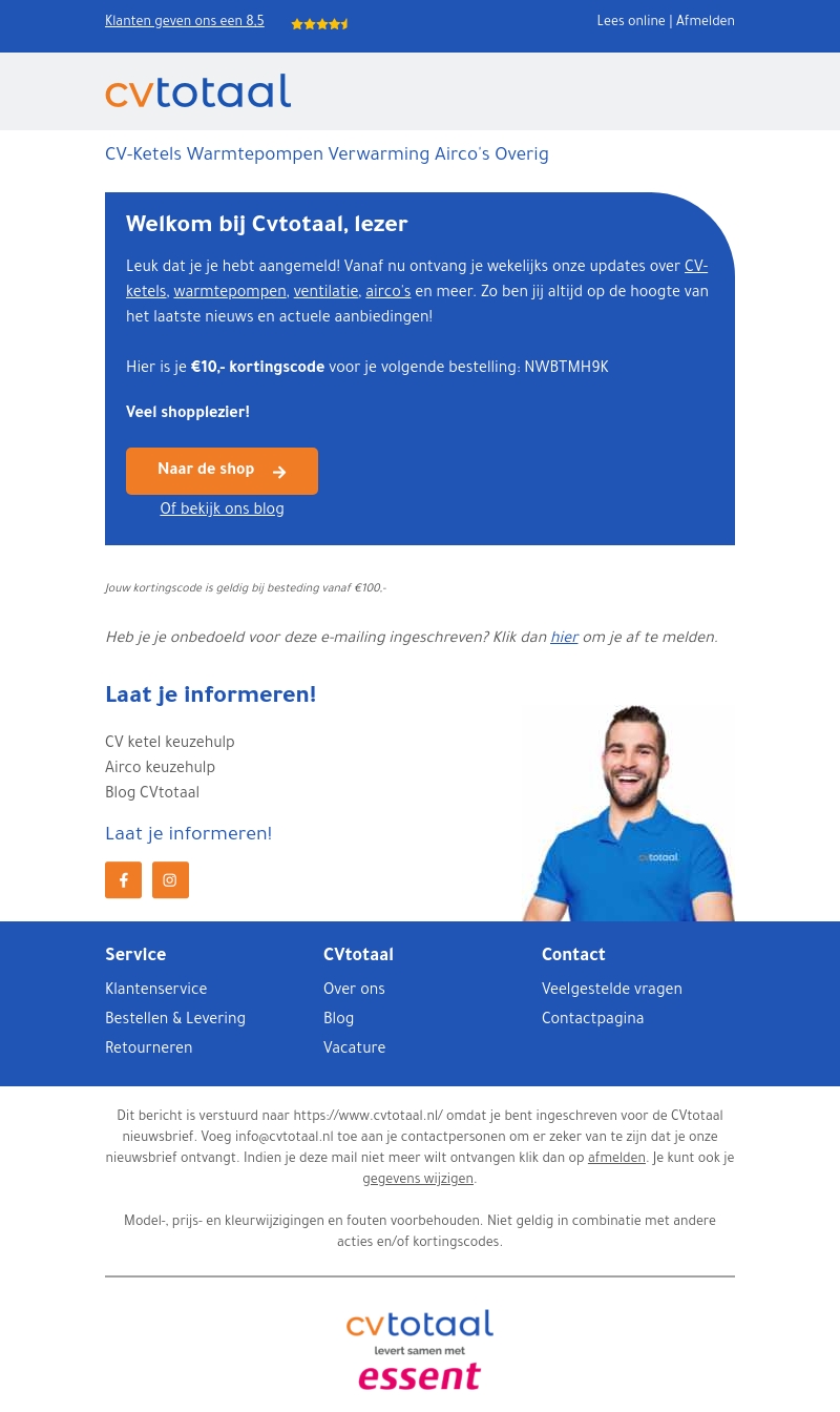 Leuk dat je je hebt aangemeld bij Cvtoal! Ontvang vanaf nu wekelijkse updates over CV-ketels, warmtepompen, ventilatie, airco's en meer. Profiteer direct van onze β¬10,- kortingscode op je volgende bestelling. Veel shopplezier!