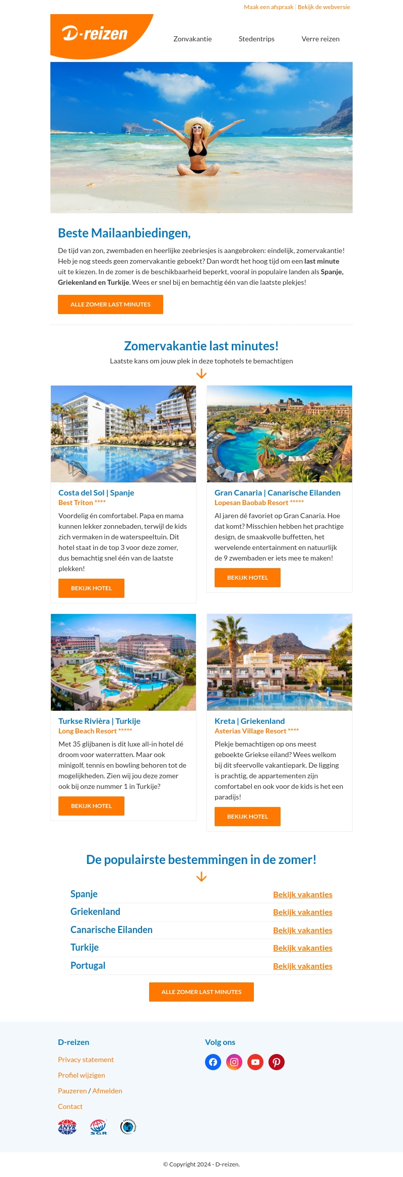 De tijd van zon, zwembaden en heerlijke zeebriesjes is aangebroken: eindelijk, zomervakantie! Heb je nog steeds geen zomervakantie geboekt? Dan wordt het hoog tijd om een last minute uit te kiezen. In de zomer is de beschikbaarheid beperkt, vooral in populaire landen als Spanje, Griekenland en Turkije. Wees er snel bij en bemachtig één van de laatste plekjes!