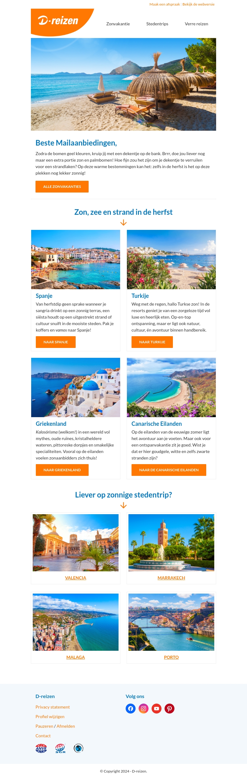 De herfst betekent niet dat je de zon moet missen! Ontdek zonovergoten bestemmingen zoals Spanje, Turkije, Griekenland en de Canarische Eilanden. Liever een zonnige stedentrip? Valencia, Marrakech, Malaga, en Porto wachten op je!