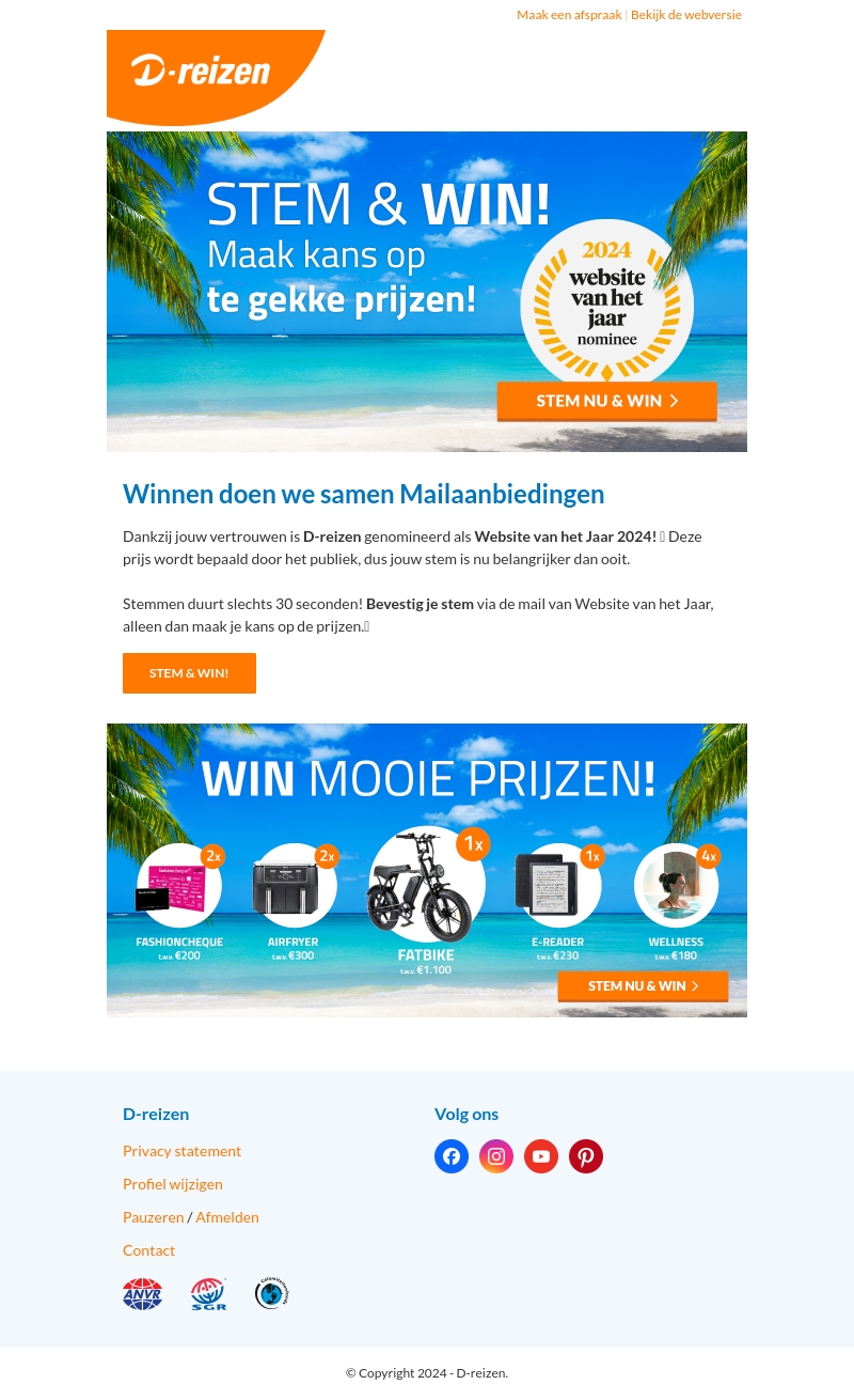 D-reizen is genomineerd als Website van het Jaar 2024! Stem nu op ons en maak kans op fantastische prijzen zoals een fatbike, airfryer, of E-reader. Je stem is ontzettend belangrijk voor ons, en het duurt slechts 30 seconden om deel te nemen!