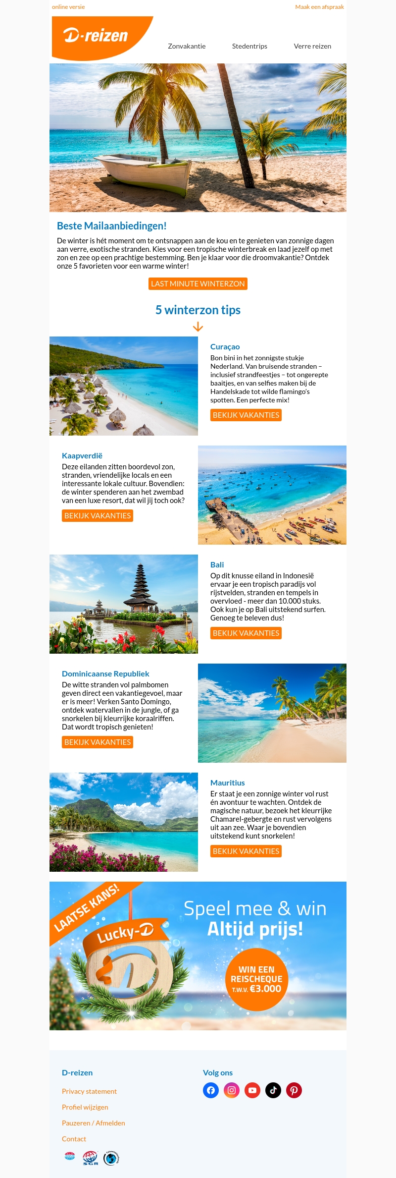 Verlang je naar warmte tijdens de koude maanden? Ontsnap naar exotische bestemmingen als Curaçao, Kaapverdië, Bali, Dominicaanse Republiek en Mauritius. Geniet van zonovergoten stranden, levendige cultuur en serene rust. Kies jouw perfecte wintervakantie en beleef een tropisch avontuur.