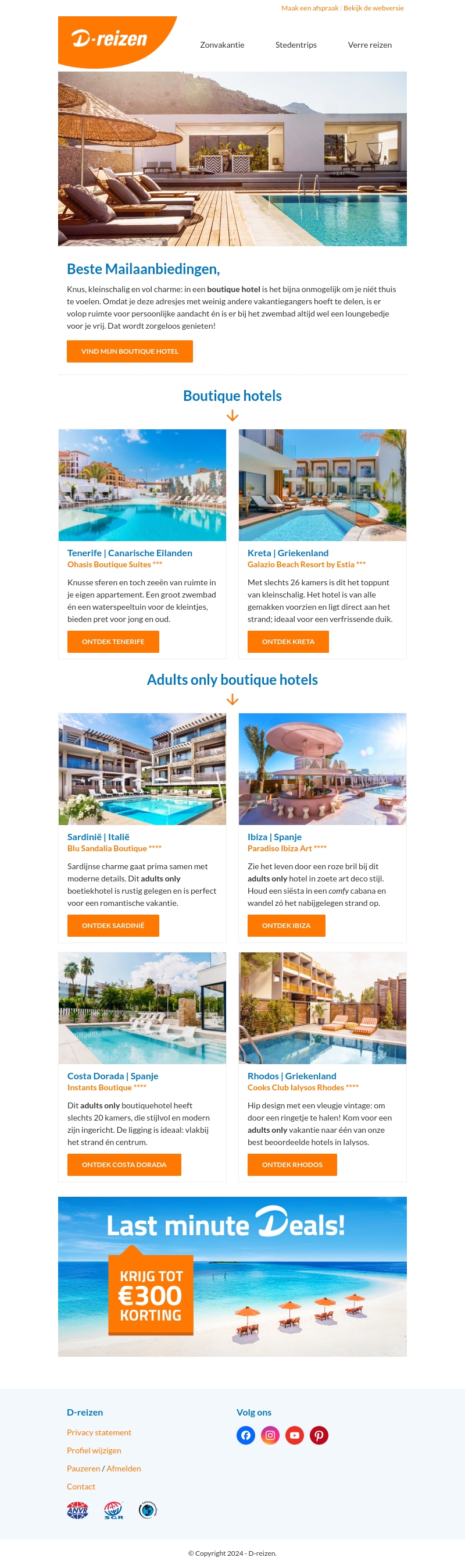Ervaar de charme van onze exclusieve boutique hotels en adults only resorts. Ontsnap aan de drukte en geniet van persoonlijke aandacht, luxe voorzieningen en prachtige locaties. Bovendien profiteer je nu van last minute deals met kortingen tot €300.