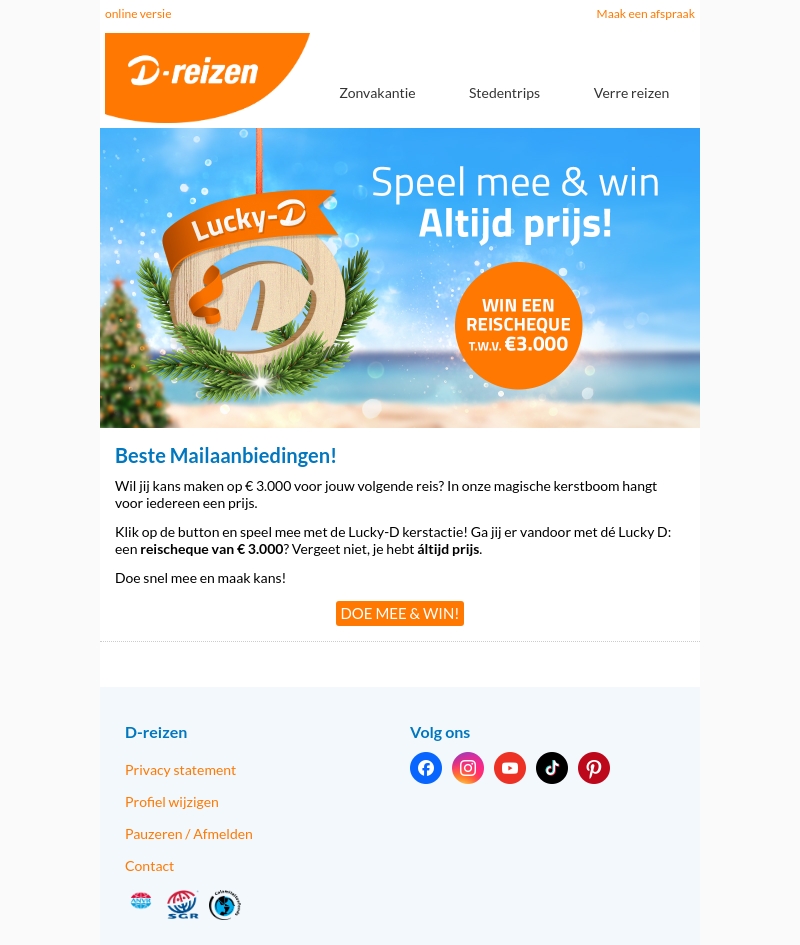 Beleef een magische kerst met D-reizen! Doe mee aan de Lucky-D Kerstactie en maak kans op een reischeque ter waarde van €3000. Vergeet niet, er hangt altijd een prijs aan de boom. Speel mee en verdien jouw volgende droomreis!