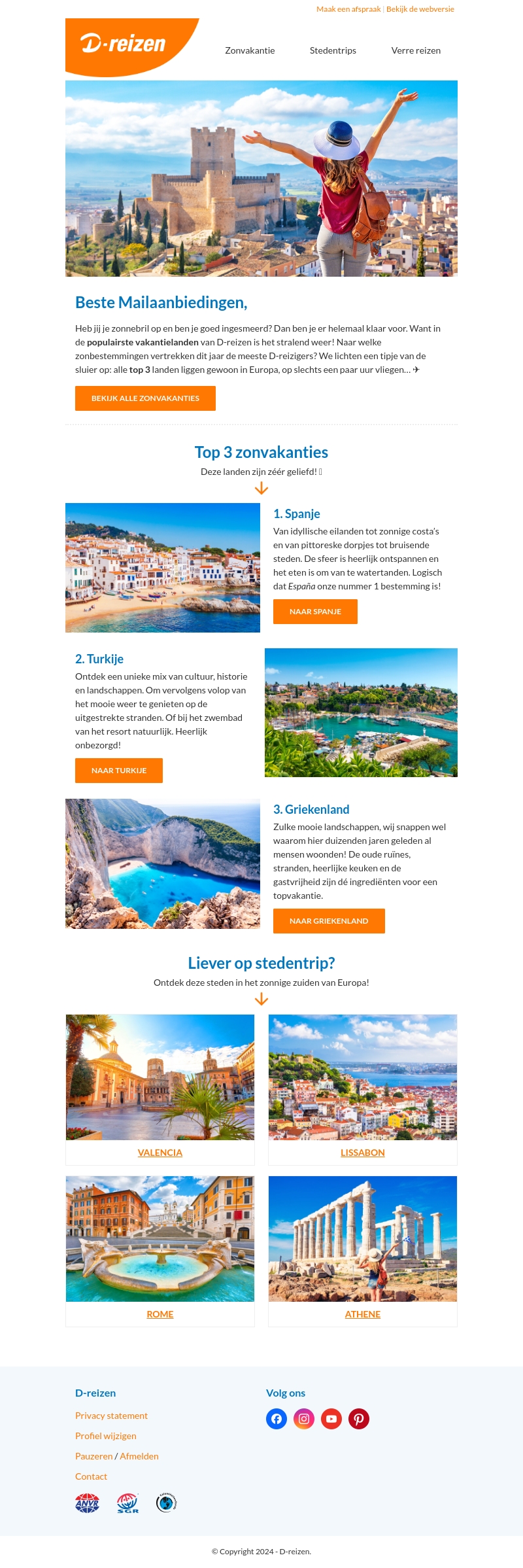 Ben je klaar voor een zonvakantie? D-reizen heeft de top 3 zonbestemmingen voor je op een rij gezet: Spanje, Turkije en Griekenland. Laat je inspireren door idyllische stranden, historische steden en heerlijke eetervaringen. Boek nu en geniet van je droomvakantie!