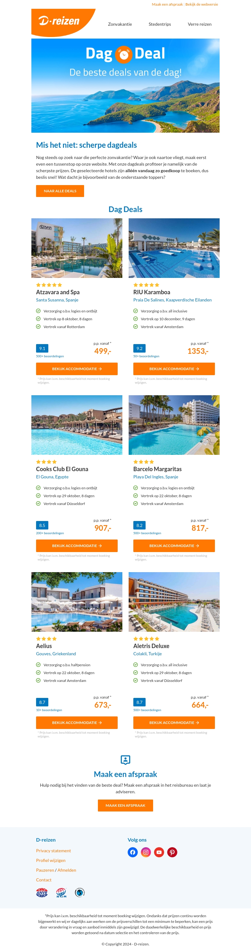 Ben je nog op zoek naar de perfecte vakantie? Kijk dan snel bij D-reizen voor de beste dagdeals! Vandaag kun je profiteren van scherpe prijzen op zorgvuldig geselecteerde hotels. Van een zonnige vakantie in Spanje tot een luxe verblijf in Turkije, ontdek de topdeals van vandaag.