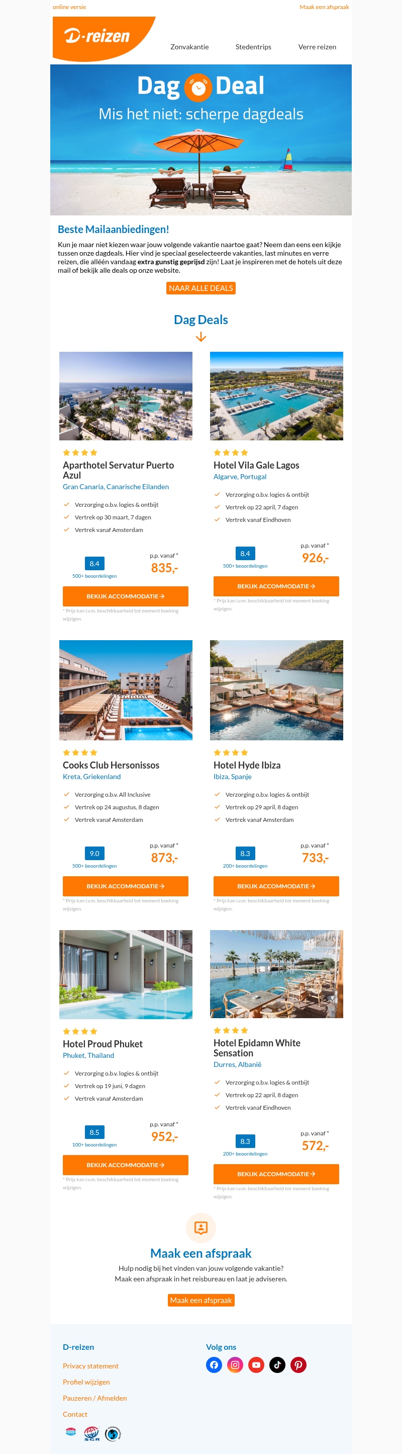 Geniet van exclusieve dagdeals en ontdek de perfecte vakantie voor jou. Van zonvakanties tot stedentrips en verre reizen, er is volop keuze. Met scherp geprijsde opties en vertrek vanuit diverse steden, ben je zo op weg naar je volgende avontuur.